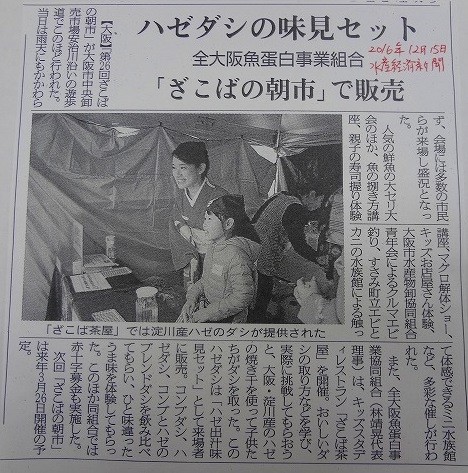 11月27日に開催されました「ざこばの朝市」での全大阪魚蛋白事業協同組合の取組が12月15日付けの水産経済新聞に掲載されました。